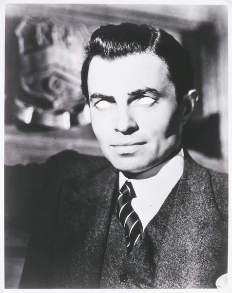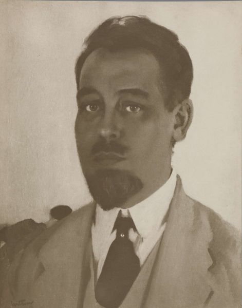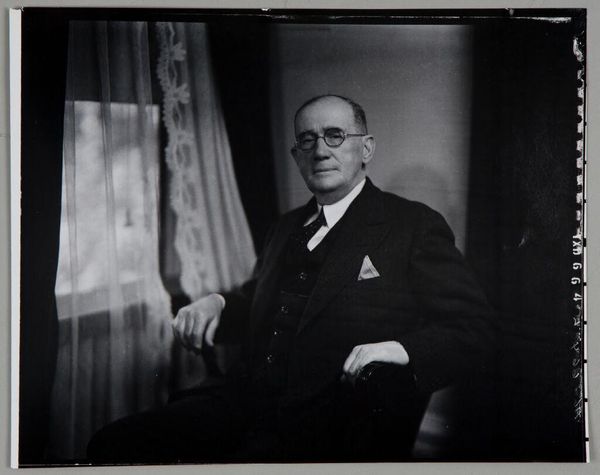 Editor: This is Dorothea Lange's gelatin-silver print from 1929, titled "Untitled, portrait of William." It feels like a very composed, formal image, almost staged. How do you interpret this work? Curator: Considering its creation in 1929, before Lange's iconic Depression-era photography, this portrait offers a glimpse into the artistic and social context she navigated. We see a man presented in the visual language of success and aspiration. How does the "everyday" relate to portraiture as an established genre with all of its implied conventions of social position? Editor: I see what you mean, he definitely looks affluent. Curator: The deliberate choice to photograph him in a suit with a pocket square evokes particular social ideals associated with class and masculinity during that time. How does this influence the viewers relationship to the artwork and subject in terms of seeing him as a “type”? Editor: It’s interesting, the softness in his face and his gaze seem to challenge that, it makes him look contemplative. Curator: Exactly. Lange often questioned the existing politics of imagery. A powerful photograph doesn't simply mirror reality; it actively participates in shaping perceptions and understanding. Do you see hints of that approach here, prefiguring her later, more overtly political work? Editor: I see that now, this wasn't just documenting, it was commentary. That gives me a new appreciation for Lange's eye, even early in her career. Curator: Indeed. It illustrates how even seemingly straightforward portraiture can be deeply embedded within socio-political conversations.