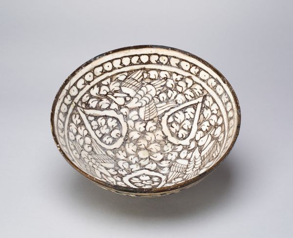 Editor: This is a ceramic bowl, likely earthenware, from the Ilkhanid Dynasty, sometime in the late 13th or early 14th century. It's at the Art Institute of Chicago. I’m immediately drawn to the central image of the animal – possibly a cheetah. The colors and geometric designs create such a fascinating contrast! What's your interpretation of its cultural significance? Curator: It's fascinating how this bowl serves as a snapshot of cultural exchange under the Ilkhanids. This dynasty, a branch of the Mongol Empire in Persia, fostered trade and artistic fusion across Eurasia. The cheetah, frequently depicted in royal contexts, hints at the bowl’s function – perhaps for elite use? What does the blend of Persian, Islamic, and Mongol influences suggest to you about the art market then? Editor: It makes me think about how globalization isn't a modern concept! Luxury goods moved across vast distances. And it seems like this piece reflects that taste was likely influenced by cross-cultural interaction in the markets. But why ceramic? What does the choice of materials mean for the intended audience? Curator: Ceramics were practical but also capable of exquisite artistry. High-end ceramics could emulate the prestige of metalwork, appealing to a wealthy, discerning clientele. This bowl reveals the dynamics of power through visual display. What social statement do you think objects like this might have made at the time? Editor: It was probably a way to showcase status and wealth in a region that had deep trade connections to China. I never thought about ceramics as objects loaded with meaning beyond their function. Thanks! Curator: Indeed. This object reminds us that art is never created in a vacuum; it’s part of larger social, economic, and political narratives. Considering an object’s display and function illuminates the story of its creation and audience.