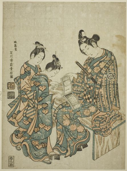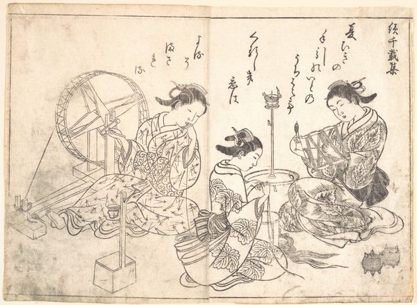 Editor: This print, "Two Women in a Room Opening on a Verandah" by Hasegawa Mitsunobu, circa 1720-1740, presents an intimate domestic scene using delicate lines. It's so visually rich, but also very simple! What do you see when you look at it? Curator: Well, considering this is Ukiyo-e, or "pictures of the floating world," we must think about the social context. These prints, mass-produced, were aimed at a merchant class, newly wealthy and eager to engage with art. So, this intimate scene, seemingly of leisure, is actually participating in a broader commercial art market. It reflects and reinforces the idealized beauty and lifestyles popular at the time. Do you think it's successful in doing that? Editor: Definitely. The figures seem serene, like archetypes rather than individuals. But how would that resonate with viewers then? Curator: Precisely. This relates to the political role of imagery. In a rigid social hierarchy, these prints offered a controlled form of escapism. They allowed the rising merchant class to admire, even consume, images of a refined lifestyle that might have been otherwise inaccessible, yet also reinforcing social norms by dictating how that ideal lifestyle should look. Think about how public imagery continues to function similarly today. Editor: That makes sense. It's not just a pretty picture; it's about constructing and circulating a social ideal. I hadn't thought about the power dynamic at play here. Curator: Exactly. It raises the question: Who gets to define "beauty" and "refinement," and what are the social consequences of that definition being so widely distributed? It’s a complex interplay between artistic expression and social engineering. Editor: Wow. It's made me see Ukiyo-e in a totally new light. Thank you! Curator: My pleasure. Always consider the market when it comes to images.