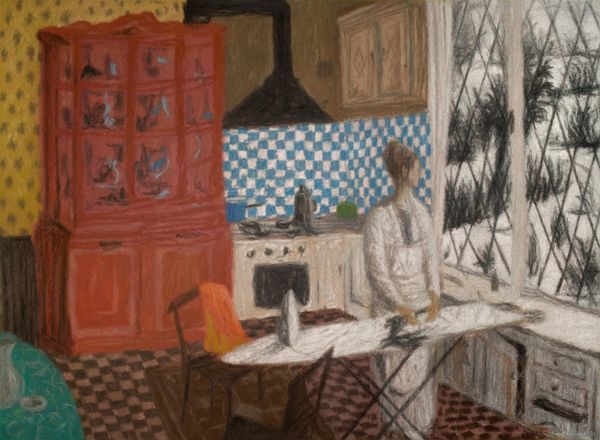 Editor: We are looking at "Aunt’s Salon" by Iwo Zaniewski, an undated oil painting that’s wonderfully… cozy. The brushstrokes are visible, giving it an almost fuzzy texture. The warm tones, like the red cabinet, contrasted with cool hues, like the lavender chair, evoke a comforting, domestic mood, wouldn’t you say? What initially stands out to you? Curator: Cozy is the perfect word. It’s like stepping into a memory, isn’t it? What gets me are the layers, not just of paint, but of time, of lived experience. The portraits peering from the walls, the seemingly random collection of objects – they whisper stories. Imagine spending hours in this room, just breathing it all in. Do you think the artist is celebrating or perhaps slightly poking fun at the bourgeoisie's interior fetish? Editor: I see what you mean. The somewhat distorted perspective could definitely be a commentary. What about the painting within the painting? The one being created by the person in the easy chair, looking at what's in front of them? Does that hint at anything deeper, any idea of 'art imitating art?' Curator: Aha! The art within art…a Möbius strip of creativity! It suggests a self-aware loop. Zaniewski paints the painted. Think of the artist questioning his own vision. Or perhaps suggesting art can't perfectly represent real life: it merely offers its version, influenced by the artists own world. How meta, right? Is that artist *truly* in Auntie's salon, or in a dreamscape conjured in paint? Editor: Wow, that makes you wonder…it's more than just a room; it's a little world, reflecting on itself. Thanks! I never thought about all of that before. Curator: My pleasure. It just goes to show, the coziest corners can hold the biggest ideas. Let’s keep wondering, keep looking. Art rewards a curious eye!