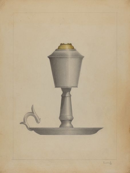 Here we see "Candlestick" by Philip Johnson, a study rendered with graphite and watercolor washes. The drawing captures a humble object, yet the artist's meticulous attention transforms it into a study of form and light. Johnson's use of line and shadow creates a palpable sense of volume, giving weight to the cylindrical stem and the curved reflector, which is rendered in subtle gradations of grey. The work explores the basic geometric forms, the interplay of light and shadow emphasizing their sculptural qualities. The composition invites us to consider the object not just as a functional item but as a design form. The candlestick is elevated to a subject worthy of artistic scrutiny by reducing its elements to basic shapes, which recalls early modernist concerns with geometry. The artist’s choice of medium, the precise lines, and the subtle variations in tone, all contribute to the silent aesthetic power of the design.