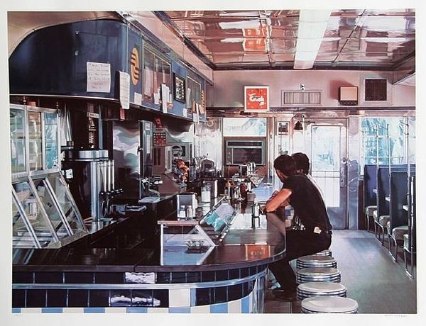 "Fame Cafe, Hollywood" was captured by Jim Goldberg, likely using a film camera, as indicated by the print's materiality. The image's grainy texture evokes a sense of grit and authenticity. The image harnesses the stark contrast of black and white which highlights the cafe's tired interior and the solitary figure of the worker. The focus on a mundane scene—a worker in a near-empty cafe—reflects a broader commentary on labor and the service industry's role in the myth-making of Hollywood. It also shows how an image, made through a mechanical, reproducible process, can bring out the social context of labor and class. By looking at Goldberg’s practice, we realize that the choices of materials and techniques are essential for understanding the full meaning of the work and challenging traditional distinctions between art and social documentation.