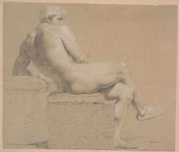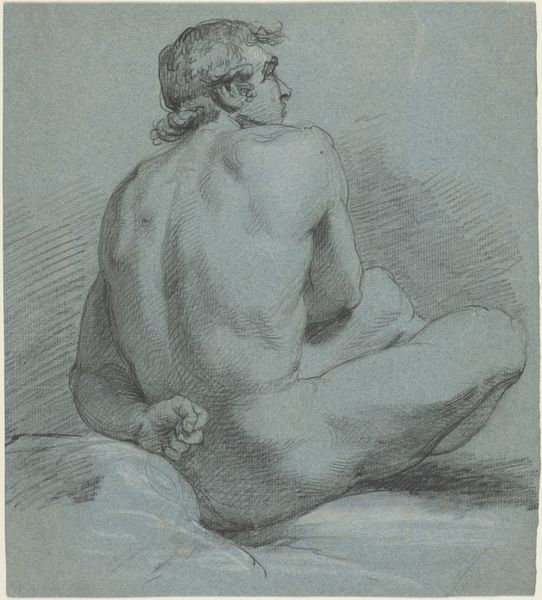 Editor: Here we have Otto Scholderer's "Sitzender männlicher Rückenakt," a pencil drawing on paper from 1855. I find the figure's relaxed pose quite striking, yet there's a certain melancholy to the subject's averted gaze. How do you interpret this work? Curator: This drawing provides a compelling entry point to discuss the conventions and power dynamics inherent in the artistic representation of the male nude, especially within the 19th century context. We might consider, for instance, how academic traditions often served to idealize the male form, frequently overlooking the diverse realities of male bodies. The choice to present the back view may also be interpreted, signaling an intent to invite the viewer to gaze upon an anonymous, depersonalized body. It leads me to consider the purpose and effect of that choice: what does the artist aim to achieve by focusing on the subject’s back? Editor: That’s a very interesting way to think about it. I initially saw it simply as an exercise in form, a study of anatomy. But I hadn’t considered the power dynamics involved in depicting the nude. Curator: Exactly. How does Scholderer's work either conform to or challenge normative ways of portraying male nudes and what conversations does this incite about gender, observation, and power within the art historical canon? Consider how art production reproduces or destabilizes broader socio-political conventions? Editor: That gives me a lot to consider in future works I analyze, too. I had never explored the artist’s intent on gender or class issues. It seems clear how such interpretations could influence its place in art history. Curator: Indeed, this one pencil sketch opens pathways to discuss broader social questions in the study and creation of art. It highlights how paying attention to the past and the present are interwoven and affect our gaze.
