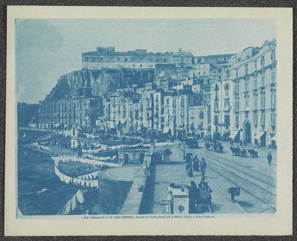 Editor: This photograph, taken by Giorgio Sommer between 1860 and 1890, shows a bustling street scene in Naples. I am fascinated by how this black-and-white image encapsulates the past and provides a peek into a world seemingly long gone, even in its own time. What symbols or layers of meaning do you think stand out most here? Curator: I see a powerful statement about modernity’s march juxtaposed against the enduring symbols of power and place. Note how the horse-drawn trams share the space with pedestrians and older buildings. Do you observe a subtle tension between the "old" and the "new"? Editor: Absolutely. The cliffside castle looms, while daily commerce bustles below, highlighting contrasts. Curator: Yes! It also acts as a marker of time. Photography like this becomes a repository of cultural memory. It reminds us how quickly cityscapes and lifestyles change, but how certain structures and power dynamics can remain stubbornly fixed in place, doesn’t it? Editor: That makes me think about the role of photography in documenting history but also maybe shaping our perceptions of the past. Does the choice to capture this particular scene and these specific details tell us something about Sommer’s own viewpoint? Curator: Precisely! Sommer wasn't simply recording; he was curating a narrative about Naples at a critical juncture. This resonates even today, influencing how we interpret urban development and its consequences. What do you take away from that thought? Editor: I never considered the shaping and manipulation within photographs that record realism! It almost feels like an artifact, which presents both subjective and objective truths simultaneously!