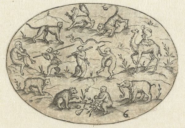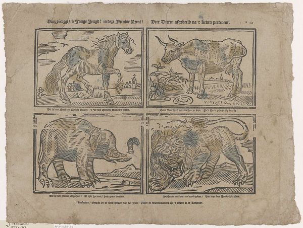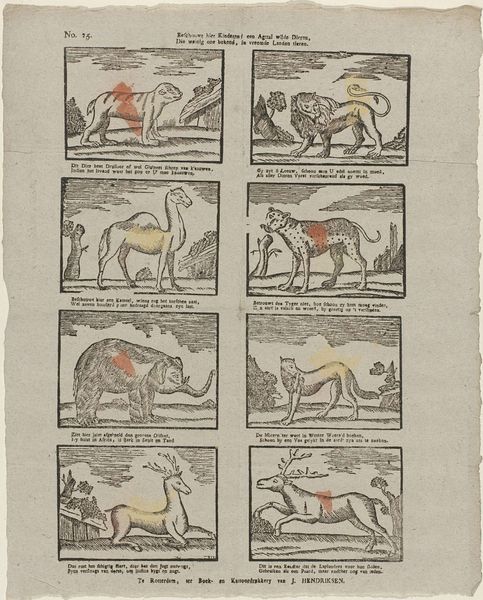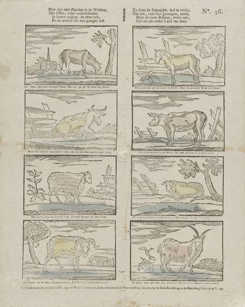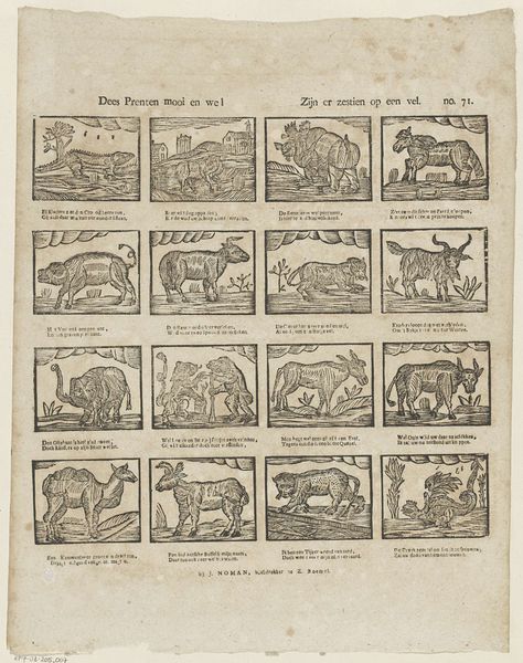Curator: This unassuming print, currently residing at the Rijksmuseum, offers a fascinating glimpse into early 19th-century Dutch culture. Its full title is "Deez' dieren, toonen zich als leevend voor uwe oogen…," and it was created sometime between 1806 and 1830. Editor: My first thought is the starkness of it – the black lines on the beige paper, it creates a feeling of pedagogical simplicity almost like flashcards meant for instruction. A moral lesson via the animal world, I presume? Curator: Precisely! Created by Johan Noman, this engraving utilizes simple depictions of various animals, arranged in square panels, each accompanied by text. It wasn’t just a representation of animals, but served as a moral and educational tool, aiming to instruct "kleene jeugd!"– the small children – about the relative worth and character of beings. It also clearly asserts mankind as superior. Editor: It's interesting how the arrangement of the animals almost becomes a social hierarchy reflected in its layout. Did Noman intend to also reinforce a hierarchy by presenting them in a grid, a rigid display that subtly guides perceptions on who gets prominence through position and, literally, through being at the 'top' versus the bottom. The use of vernacular is particularly salient given we know print and dissemination of knowledge had distinct class stratifications. Curator: It's very possible and this also fits neatly within larger colonial projects of naturalizing socio-political categories as innate differences of being. He contrasts animal behavior with implied human virtues. The dog, the horse, the cow—these aren’t merely animals, they represent traits worthy of emulation or scorn, within a specific socio-economic framework. And how these 'lessons' trickle down into domestic education, particularly shaping ideas in emergent adulthood is particularly striking. Editor: It truly prompts us to question how seemingly innocuous images can reinforce dominant ideologies, quietly molding perception and self-conception, then and even today. Curator: Indeed. By examining the role of prints like this one, we start to peel back the layers and unravel how societal structures get reinforced through artistic and cultural productions aimed to form subjects from early age.