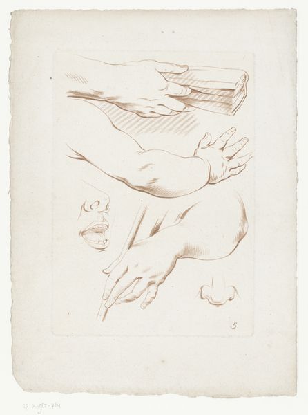 Jean François Janinet created this print, "Three Arms in Various Positions," using etching and aquatint, a popular printmaking technique in the late 18th century. Janinet, a French artist, was working during a period of significant social and political upheaval, including the French Revolution. The rendering of the human body, or even parts of it, carries its own set of cultural and social meanings. Consider, for example, the disembodied arms here. These are studies, a means to understand the form and how it moves, which speaks to the time when anatomy and the body were approached with an increasing scientific interest. It also reflects a society grappling with ideas of individualism and identity. By focusing on isolated body parts, Janinet invites us to contemplate the relationship between the part and the whole. The arms become detached, abstracted, and open to interpretation. The print invites reflection on how we perceive and represent the human form. It underscores the emotional and intellectual weight we assign to even the smallest details.
