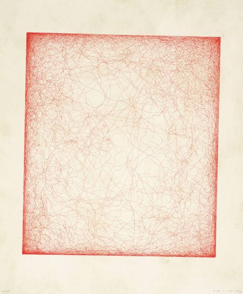Curator: At first glance, Gego's "Untitled" drawing from 1980 hits me with an odd mix of rigid structure and playful chaos. A constellation of lines! Editor: Indeed. It presents a web of brown lines forming interconnected triangles and other geometric shapes, all overlaid on a light blue and white wash that softens the overall feel. I’d describe it as an intersection of fragility and formal order. Curator: Fragility is the perfect word! Like the skeleton of something beautiful and strong, now exposed and vulnerable. It’s clearly an abstraction, but it's dancing on the edge of representation; makes you wonder what the artist was truly seeing. Editor: Right. Gego's body of work often uses geometry to represent networks, physical structures, and social connections. Look closer at those triangles. Consider their historical prevalence—mathematics, spirituality, even construction! Here they almost become an architectural diagram stripped bare. Curator: And stripped beautifully, if I may add. I'm captivated by how seemingly simple lines can convey such complexity, and, oddly enough, a sense of unbound freedom! The light seeping through those semi-transparent shapes reminds me of sunlight piercing through the forest canopy. It might sound bizarre, but I swear it breathes! Editor: That breathing sensation, I think, echoes Gego's interest in challenging rigid forms with the ever-present imperfections of the handmade, of the imperfect lines we perceive. We find ourselves searching for the logic—the mathematics that can resolve what seems to float and breathe into wholeness, but Gego never seems to promise resolution. Curator: That might be the point—the invitation! No resolutions, just raw questions hanging in space. You come to realize it doesn’t need answers; its poetry lies precisely in this beautiful state of suspense. Editor: Absolutely, suspended, unresolved, connected by a breath and the suggestion of blue sky.