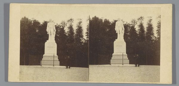 This stereoscopic photograph shows the statue of Hendrik Tollens in Rotterdam, and was taken by Pieter Oosterhuis. Although undated, it's important to consider the 19th-century context in which this image was created. Stereoscopic photography offered viewers an immersive, almost tangible experience of a scene, reflecting a cultural desire for realism and engagement with the world. In the 19th century, public monuments were potent symbols of national identity and cultural values. Statues like that of Hendrik Tollens helped solidify a collective memory, honoring figures deemed important to Dutch society. Consider what it means to memorialize someone in this way, particularly a poet. How does the act of erecting a statue transform a person into a symbol, and what does it mean to preserve this image through photography? This photograph isn't just a depiction; it’s a statement about who and what society chooses to remember. It invites us to reflect on the cultural narratives that shape our understanding of history and identity.