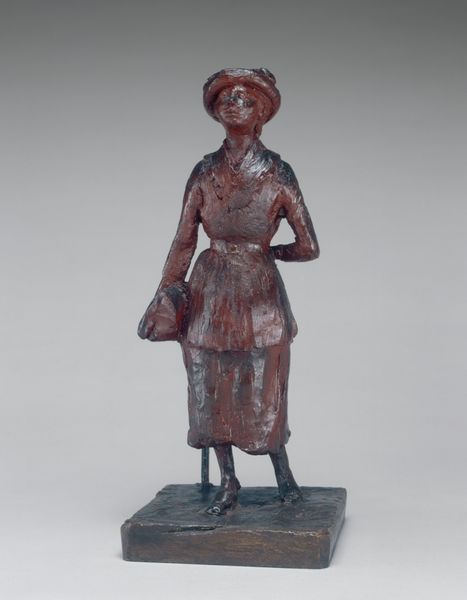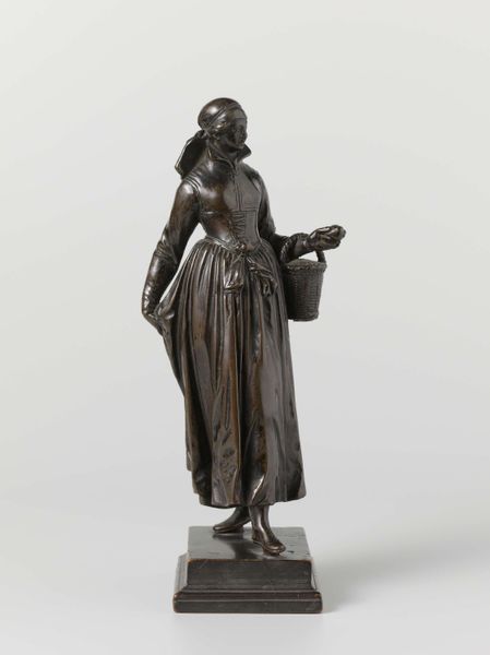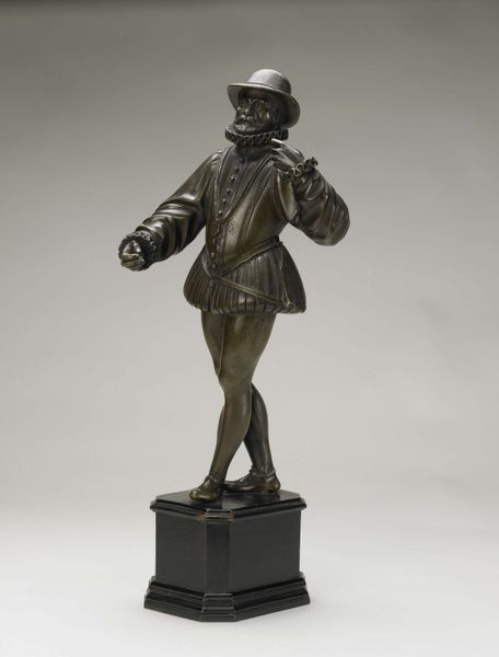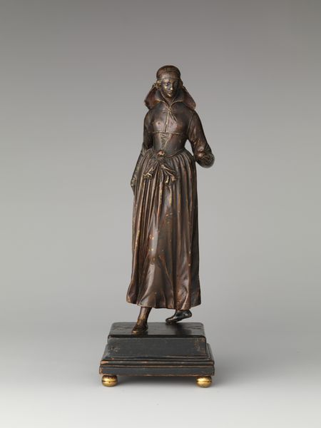 Editor: We’re looking at "Young Lord and Young Woman," a bronze sculpture created by Barthélémy Prieur around 1600 to 1611. It has a kind of poised, self-assured quality. I'm curious, how do you read the social context of a piece like this? Curator: Well, its small scale tells us something right away: bronze sculptures like this were often made for private collections, a sign of wealth and status. How do you think the subjects of these sculptures would have wanted to be perceived? Editor: I’d guess powerful and elegant? They look ready to receive an audience. Is it accurate to say bronze sculptures might present a certain aspiration? Curator: Precisely. It's interesting to consider what ideals were being circulated and reinforced in elite circles at the time. It raises questions about patronage. Who commissioned Prieur and what image did they hope to project? Think about the cost of bronze and the skill required. The statue embodies privilege but the message must have political reverberations. Does the confident pose resonate with other contemporary images? Editor: Now that you mention it, yes, that pose is often adopted in other regal contexts of the period. Also, it's interesting how bronze can immortalize the elite for posterity, dictating how history remembers them. Curator: Indeed, and think about where this sculpture was likely displayed— perhaps a cabinet of curiosities or a private study— spaces intended for contemplation and conversation among a select few. Considering that public art fulfilled a very different set of social functions. Editor: This definitely makes me reconsider sculpture's role in actively reinforcing certain ideals and power dynamics within 17th century French society, both explicitly and implicitly. Curator: And I am also considering new research that is contextualizing public and private art production as very different circuits that served distinct socio-political purposes.