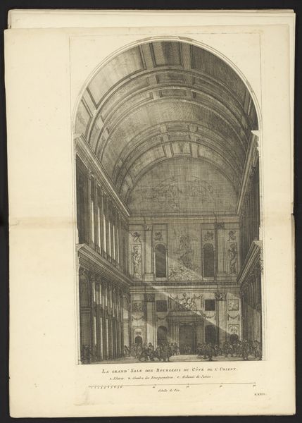 Editor: Here we have "Trap in het Palais Royal te Parijs" by Jean-Baptiste Arnout, dating from 1824 to 1829. It's a watercolour drawing, and it has this very subtle, almost faded quality. It gives a sense of the past. What can you tell me about this work? Curator: Well, the Palais Royal was a crucial site of social and political life in Paris. Arnout's rendering captures that in-between space, a stairway as theatre. Note how the architecture emphasizes hierarchy. Editor: I do see the staircase emphasizes hierarchy, who had access to this space? Curator: Precisely! Consider that the Palais Royal, while nominally a royal space, became a commercial and social hub after the Revolution. These promenades were meticulously surveilled and socially coded spaces. This stairway, connecting different levels, symbolizes access and restriction based on social standing, you might say. Editor: So the artist is hinting at the power dynamics at play? Curator: Exactly. The Palais Royal was known for its gambling dens, cafes, and brothels. Arnout captures the subtle but present policing of these activities by the figures of authority visible in the artwork. Do you see any signs of the blending of public and private life? Editor: I think I see what you mean about the blending of spaces and power now. This ordinary scene is anything but. Curator: I find it amazing that the drawing appears ordinary. Its significance lies in its role of documenting this important period. Editor: It really makes you consider the everyday politics of being in a place like this at that time. Thanks for pointing that out. Curator: My pleasure. Hopefully we are thinking more critically about urban environments today!