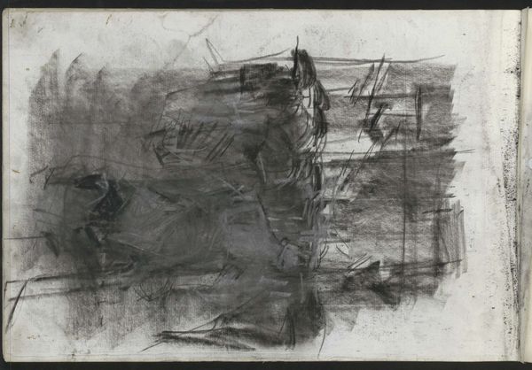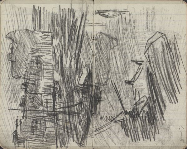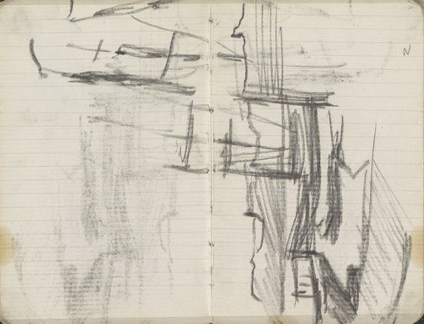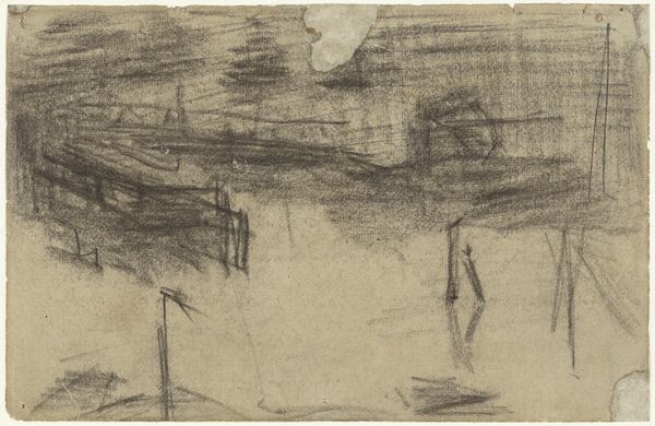 George Hendrik Breitner captured this charcoal drawing, titled 'Gezicht op de Dam te Amsterdam met de Nieuwe Kerk,' in his sketchbook, offering us a glimpse into late 19th-century Amsterdam. Breitner was known for his gritty, urban scenes, a stark contrast to the romantic landscapes favored by many of his contemporaries. What we see here is not a picturesque postcard, but a raw, almost hurried impression of the city center. The sketch captures the mood and movement of a place undergoing rapid change. Breitner was interested in the lives of ordinary people, and he sought to represent the experiences of those living in an increasingly industrialized society. His work invites us to reflect on the relationship between urbanization, identity, and lived experience. What does it mean to find beauty and significance in the everyday? How do our surroundings shape who we are and how we see the world?