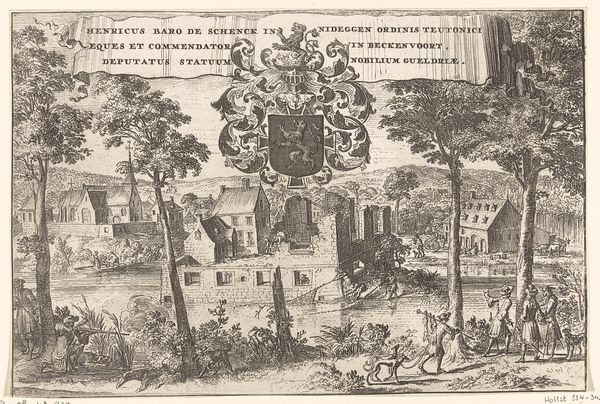 Curator: This print, titled "Bedevaartgangers bij Onze Lieve Vrouwe ter Nood te Heiloo, 1637," meaning Pilgrims at Our Lady of Needs in Heiloo, was created by an anonymous artist. It is an engraving dating to after 1637, capturing a specific genre scene. What's your initial feeling? Editor: It feels desolate, yet hopeful, doesn't it? Like a forgotten fairytale. The light bursting from the chapel ruins... is that supposed to be miraculous? And those supplicants in the foreground. They have such gravitas. Curator: Indeed, the technique of engraving lends itself to these contrasts. Notice the dense, controlled lines create varied textures - the rough bark of the trees versus the smoother surfaces of clothing, giving the entire scene remarkable depth. And, look up at the inset diagrams – those are vital for understanding its making. One shows the original chapel, while the other illustrates the foundation. This detail is significant for understanding the material conditions of the building’s history, even if ruinous. Editor: Ruins. I find myself fixated on what must have come before that moment of collapse. Who labored on the original construction, who decided to place this particular sculpture there, why would anyone in their right mind climb all of these little mole hills to look? Is it possible that devotion becomes mixed-up with habit and the aesthetic appreciation of melancholy landscapes? Curator: It points to an entanglement between spiritual beliefs and practical realities of community life in the 17th century. This print probably circulated widely to promote this site as a destination for pilgrimage and to reinforce the economic benefit for the city! Editor: So, an early form of religious tourism, essentially. Even holy acts, as recorded on this plate, end up processed as consumable imagery for broader appeal. Strange. Though I will say, beyond its functionality, that lone figure beneath the tree on the far left moves me for his apparent utter dejection. Curator: Such small details add complexity, questioning an idealized narrative. It's a powerful convergence of artistic production, religious belief, and the everyday experiences of people in this period. Editor: Looking closer, I now see that everyone brings their dogs with them! No-one leaves home without them. I suppose this image is a useful reminder of how things work: material circumstances and individual longings intersect in art, sometimes seamlessly and sometimes gratingly. Curator: Yes, and in this artwork, we observe that interaction etched permanently on the printing plate.