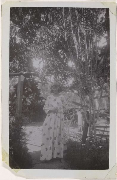Curator: Hendrik Doijer created this photographic portrait, "To bij woudreus op Tourtonne," sometime between 1903 and 1910. Editor: What strikes me first is the scale—the young woman in a white dress utterly dwarfed by the immensity of the tree. It's almost dreamlike. Curator: Absolutely. Doijer was deeply embedded within a Dutch artistic milieu grappling with colonialism, specifically life and landscape within the Dutch East Indies. Photography offered new ways to explore and define these territories, reflecting the power dynamics and exoticism of the era. Editor: Visually, there's a play of textures at work here. The soft focus gives the foliage and the tree bark a velvety appearance. The smooth expanse of the woman's dress serves as a striking contrast. It’s not purely representational, but infused with a painterly sensibility. Curator: That tension between reality and artistic manipulation is at the heart of pictorialism, a movement Doijer associated himself with. It pushed photography beyond mere documentation, giving license to create photographs that mirrored painting, to create meaning within social and cultural ideals. Editor: Does the sheer size of the tree imply anything about the perception of nature or environment in his society? The woman is presented to be so small compared to her surroundings. Curator: Precisely. The monumental size reflects both colonial ambition, of demonstrating and conquering wild lands, and a more romantic sensibility. This tree might be symbolic for power, exoticism, and might even hint to environmental ideas and discussions happening at that time. Editor: It leaves me contemplating humanity's place within the natural world, how we perceive and interact with it through art and these power relations. Curator: Indeed. It's a compelling snapshot that intertwines artistic style, social narrative, and our understanding of historical context through material culture.