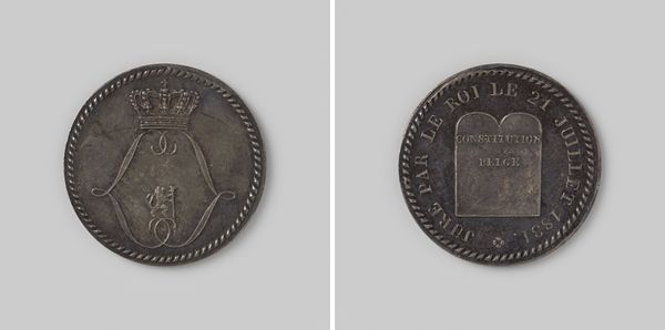 Curator: Oh, this is Joseph-Pierre Braemt's commemorative medal, "Eerste steen van het Akademiegebouw te Gent gelegd," dating back to 1819. It marks the laying of the first stone of the Ghent Academy building. It's an engraving on metal. What are your first thoughts looking at it? Editor: Austere! It's a severe little world. All that precise detail and Latin text on something so small makes it feel heavy. A bit like trying to contain a vast concept – the building of knowledge – within such rigid boundaries. Curator: I think that aligns perfectly with its historical moment. We are at the peak of Neoclassicism. Note the composition and the clean lines—everything speaks to order and reason. Braemt aimed to immortalize a significant civic event. Think about the politics of imagery during the post-Napoleonic era, particularly in cities like Ghent. A building—particularly an academy—becomes symbolic of a return to civic structure and control. Editor: The lion rampant surely isn't accidental, eh? Heraldry is never just heraldry. What's he guarding, do you suppose? The values of empire or perhaps something a bit more bourgeois and civic? Curator: Both, I would argue. The Academy embodies aspirations toward enlightened governance. It merges municipal pride with this return to classical ideals, where education theoretically serves to train able administrators. Also, note how a metal print like this made this idea of enlightened rule more democratic and widespread through distribution. Editor: But doesn't it strike you as oddly… airless? Is it a celebration, or an almost bureaucratic… brand? All very self-important, of course. Still, it misses the vibrant chaos that *always* comes along with new building, new ideas, a *future* society. I sense no possibility. Curator: Precisely! It perfectly embodies that early 19th-century struggle between revolutionary potential and a reactionary impulse. A struggle for a city like Ghent and a whole continent still reeling from revolutionary fervor. It's as if Braemt intended for that coldness, to make the metal as imposing as stone! Editor: A fascinating tension locked into a small disc of metal! Well, that gives a fellow something to ponder, doesn't it?