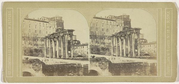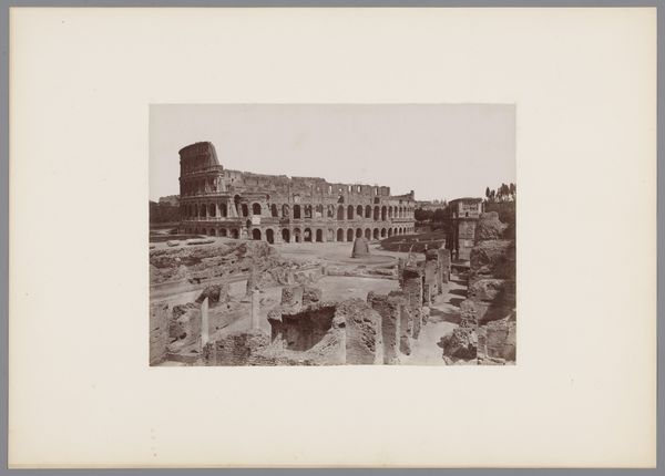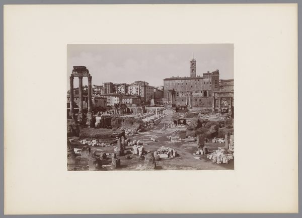 Editor: This is “Gezicht op het Forum Romanum te Rome” by Gustave Eugène Chauffourier, likely made between 1875 and 1900. It seems to be a hand-printed image on aged paper. The sepia tones create this sense of faded grandeur... What can you tell me about it? Curator: I notice immediately the tangible quality of the print. Look at the homemade paper, the irregularities. This isn't mass-produced. Think about the labor involved in creating photographic prints at this time, the processes, the materials... It emphasizes the transformation of a modern commodity into what may have been a precious personal artifact. What do you think about the choice of subject given these methods? Editor: I hadn't thought of it that way. I guess I see the Forum as this incredibly important historical place, so I didn't really make a connection to the means of its production as an image. Are you saying the *making* of the image impacts the way we understand the *thing* it depicts? Curator: Exactly! The Forum Romanum was experiencing a resurgence of popular interest, in part, due to archaeological excavations and this coincides with the rising popularity of photography. These technologies would have expanded how consumers learned about places. What story does that tell you? Editor: The materiality really reframes how I look at photography from this period. It isn’t just documentation; it’s a manufactured object imbued with a very specific social meaning related to both place and craft. Curator: Precisely. We're reminded that this “view” isn’t objective or neutral. It is an outcome shaped by specific material choices and artistic labor. Editor: That is a much more critical way to view these types of historical documents! Curator: I hope our listeners are inspired to also look critically at an image's production process, as it really affects what it can mean to them.
