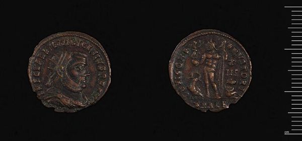 Editor: This is a follis of Maxentius, from Ostia. The coin is quite worn but there is still a palpable sense of power. What stories do you see embedded in its imagery? Curator: Coins are fascinating! They’re not just money, they’re little packages of imperial propaganda. The portrait on one side evokes Maxentius's authority. Look at the other side. Do you see the figures? Editor: Yes, I do. They look like soldiers. Curator: They are. These figures, these symbols, were meant to evoke feelings of strength, security, and continuity. A Roman ideal meant to assure and control. What do you make of this? Editor: I hadn’t considered how much these small objects were designed to broadcast a message! Curator: Exactly! Everyday objects imbued with potent, lasting meaning. It really puts history into perspective.