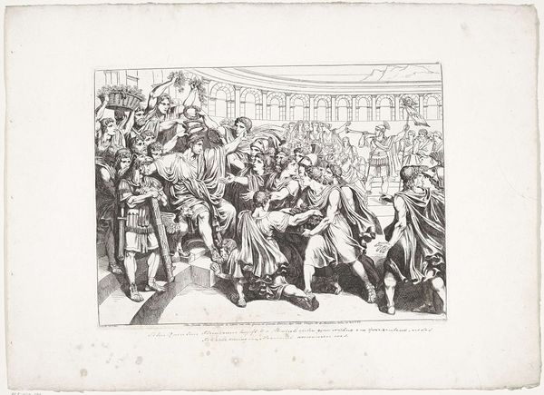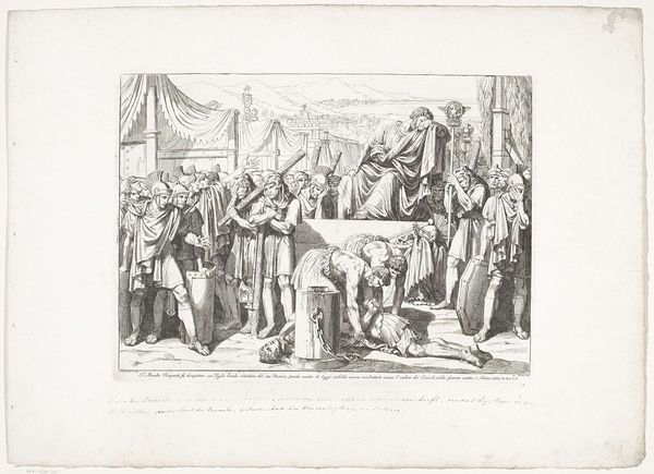 Bartolomeo Pinelli, an Italian artist, created this etching titled 'Martyrdom of Marcus Atilius Regulus in a barrel of nails,' sometime between the late 18th and early 19th century. Pinelli situates us in a brutal scene drawn from Roman history. Regulus, a Roman general, is depicted facing a horrific execution at the hands of the Carthaginians. The legend recounts that Regulus was captured, then sent to Rome to negotiate peace. However, he urged the Roman senate to continue the war, and upon returning to Carthage, he was tortured to death. This work isn't merely a depiction of historical events; it reflects the period’s fascination with classical virtues and heroic sacrifice. Yet, we cannot ignore the violence inherent in this depiction. The image raises complex questions about the glorification of violence, especially when framed within narratives of national pride. It invites us to reflect on the human cost of conflict.