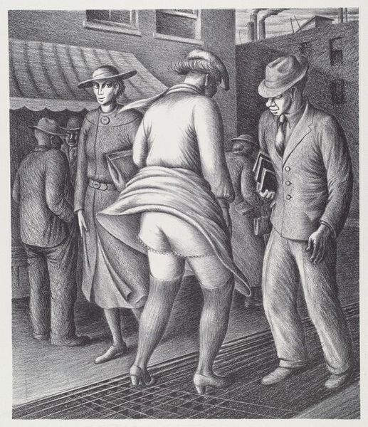 Kathleen Blackshear made this lithograph, "Saturday in Navasota", using simple mark making to describe a scene. The whole piece is an accumulation of marks. There's a tonal quality to the whole thing, a limited palette, that really lends itself to the medium. I’m drawn to the way Blackshear uses the lithographic crayon to build up the figures and forms. Look at how the density of marks creates the textures, like the cross hatching on the wall and the patterns of the shirt of the man leaning against the box. The marks are more sparse on the trousers, giving a lightness to the material, with a concentrated density around the butt. It almost feels like she is caressing the figure. It’s a very physical way of seeing. This work reminds me of Honoré Daumier's lithographs, in its social awareness. Blackshear shows us the everyday, capturing a fleeting moment in time. These kind of images don’t offer any easy answers.