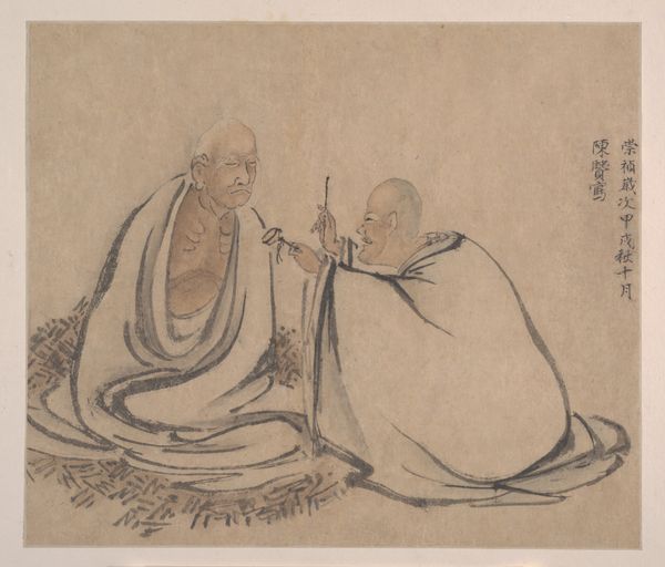 Curator: Welcome. Today we are looking at a work called “History of the Life of Tao Yuanming,” possibly created sometime during the Ming or Qing Dynasty, so potentially between 1368 and 1644. It is an ink drawing on paper and resides here at the Art Institute of Chicago. Editor: Mmm, intriguing. Immediately, I get a sense of quiet contemplation. The figures seem to be caught in a moment of inner reflection. There’s such minimalism about this—all these sepia tones and bare line work; it almost feels like witnessing a fleeting memory. Curator: Tao Yuanming, also known as Tao Qian, was a Chinese poet who lived during the Jin Dynasty, renowned for his recluse lifestyle and poems about pastoral life. It's no surprise he continues to be a popular subject in the visual arts. Artists depict not only his persona, but his embodiment of a scholar. Editor: Absolutely. I feel as though this portrait celebrates that desire to step away from worldly affairs—to seek peace in simplicity. His eyes reflect this meditative state. Curator: And observe how the social norms are subtly communicated. He is on a platform, but slightly unkempt. Notice his posture—relaxed, perhaps even indifferent to social expectations, while a figure beside him carries a vessel toward a ewer nearby. Editor: I am completely drawn to the delicacy of line. It isn't just a portrait, it also conveys a mood, it invites us to ponder what it truly means to find contentment, doesn’t it? It reminds me a bit of those ink wash paintings. I find that compelling. Curator: These types of art offer valuable insight into how cultural and societal values, such as Tao Yuanming's reclusive lifestyle, were not just tolerated but often celebrated as symbols of intellectual freedom. Editor: So next time I think about abandoning my devices, leaving society to live a simpler life of nature... Perhaps I’ll bring a drawing of Yuanming with me. That will offer a new insight. Thanks! Curator: A wise plan! It was my pleasure.