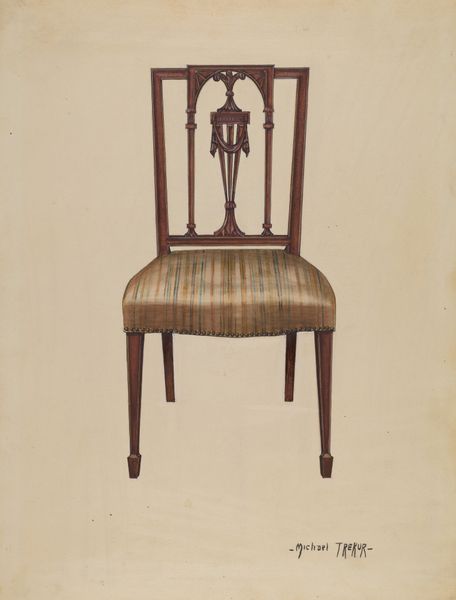 Ferdinand Cartier made this 'Armchair' with what looks like watercolor, and it's so detailed, it's like he's inviting us into the design process itself. The washes of color, especially in the striped cushion, are applied in such a way that you can almost feel the fabric's texture. Cartier wasn't trying to hide his hand; instead, each stroke seems to celebrate the potential of the medium. Look at the legs of the chair: the way the color fades in and out gives them a real sense of depth. This approach reminds me a little of Charles Demuth's architectural watercolors – that same precision combined with a kind of playful looseness. Ultimately, though, Cartier's piece speaks to the endless possibilities within representation, transforming an everyday object into a moment of quiet contemplation.