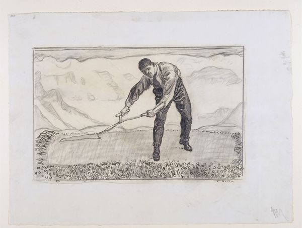 Curator: Standing before us is “Homme de Peine,” a compelling 1901 print and charcoal drawing by Pieter Dupont. The artist captures a labourer in incredible detail. Editor: It’s powerfully somber, isn't it? The hunched figure and raw depiction of manual labour evoke a sense of weariness, almost hopelessness. You feel the weight of the work in the shading alone. Curator: Dupont uses charcoal with remarkable effect, wouldn’t you agree? It contributes to the depth and drama and almost seems like he’s trying to capture the subject’s internal exhaustion with every stroke. Considering it’s rendered with dark medium, I see echoes of archetypal images of labourers performing endless labour from stories like Sisyphus or biblical figures. Editor: Absolutely, I'm particularly drawn to how this realism places labour and the working class squarely within the art historical canon, a space often reserved for nobility or mythologized subjects. The backdrop, too, suggests urban expansion perhaps at the cost of the working man's well-being. The bridge hints at progress but feels distant, unobtainable, for him. Curator: It does make you question progress when considering individual realities. I see that echoed in the man’s downward gaze; perhaps the labourer isn’t simply avoiding eye contact. Maybe he symbolizes that social reality and a system that denies workers their deserved acknowledgment. Editor: Agreed, the composition itself reinforces a hierarchy, though, between those who perform manual labour and those who presumably benefit from it. “Homme de Peine,” isn’t just a study in charcoal; it’s an observation on power, class, and marginalization. Curator: By representing toil so earnestly, Dupont has perhaps created more than just an image, but a symbol capable of engaging discussions relevant to today’s society, similar to how icons transcend their literal depictions to become vehicles for larger ideas. Editor: It encourages us to view art as a catalyst for conversation on social consciousness. Let's not only see art, but also question how the society interacts with inequality.