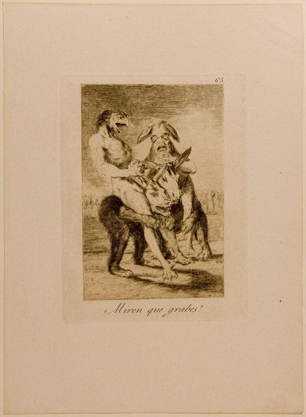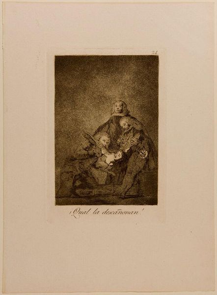 Editor: Goya's "No One Has Seen Us" is a darkly humorous etching, very unsettling. The figures seem lost in a world of intoxication and secrecy. What do you make of this scene? Curator: It feels like a glimpse into the shadows, doesn't it? Goya often used his art as a form of social commentary. This could be read as a satire of the clergy or perhaps a broader statement about hypocrisy and hidden vices. Notice the inscription, "Nadie nos ha visto" – nobody has seen us. What does that whisper to you? Editor: It suggests a sense of forbidden pleasure, but also vulnerability. It’s like they are aware of something wrong. Curator: Exactly! Goya masterfully captures that tension. It's as if they're daring us to judge them, while simultaneously craving anonymity. This print really makes you ponder, doesn't it? Editor: It certainly does. I’ll never look at wine the same way again.