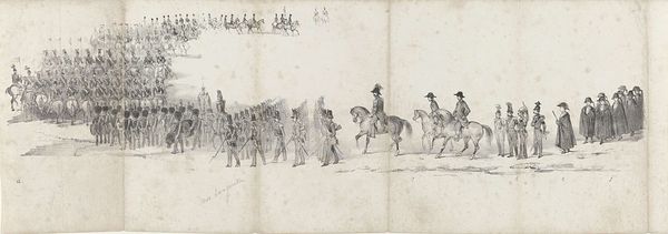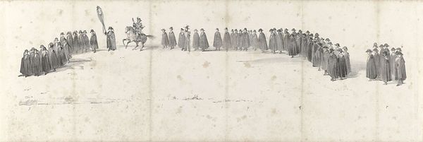 Editor: This drawing from 1849, whose artist is anonymous, is entitled *Begrafenis van wijlen koning Willem II te Delft op 4 april 1849 (blad 3)*, or *Funeral of the late King William II in Delft on April 4, 1849 (page 3)*, made with ink on paper. It depicts a solemn procession. What stands out to me is how linear and sparse the depiction is. How do you interpret this work, considering the somber subject? Curator: What I find fascinating is the repetition of figures, almost like pictograms marching across a frieze. The anonymous nature amplifies the sense of collective grief, not focused on individual portraits, but rather on the symbols of power and mourning. The repeated presence of military figures, banners, and somber attire acts as powerful symbols that would have resonated deeply. Editor: Symbols like what, exactly? Curator: Well, consider the horses and the weaponry, repeated throughout, hinting at martial strength now rendered still in mourning. And what about the very act of the funeral procession itself? It’s a ritual performance of continuity. Even in death, the image reasserts order. Editor: I suppose it shows how symbols help bridge past and present. So this is more than just a historical record? Curator: Precisely. It’s a meditation on power, legacy, and how a society processes loss. An image intended not just to show, but to embody, the weight of history. The line work creates both distance and depth; it has a feeling almost like memory itself, both present and receding. Editor: It’s amazing to think how much meaning can be packed into such a seemingly simple drawing. It gives a glimpse into cultural memory. Curator: Exactly. Understanding the power of visual language and symbolism allows us to see far beyond the surface of the artwork.