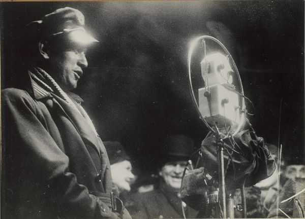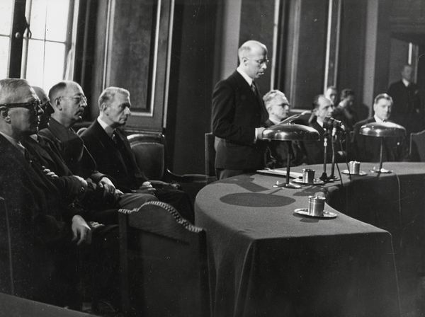 Editor: We’re looking at “Minister Van Boeyen in Londen,” a photograph taken between 1940 and 1945 by the Keystone Press Agency. It seems to be a candid group portrait. What catches your eye about its composition? Curator: Immediately, the stark tonal contrasts dictate my reading. The mid-tone grayscale renders subtle modulations nearly imperceptible. The photograph sacrifices intricacy, and this elevates the shapes. Note the repeated use of white square cups, acting as visual anchors that bind the figures across the composition. This creates a rhythmic, structured field within the frame. The arrangement also guides your eyes to the individuals within. How does the photographer's choice to frame the subjects outdoors contribute to the image's formal qualities? Editor: I guess it throws everything into a harsher light – literally and figuratively. It's not just a record of a historical event; it’s more about shape and structure. So, are you saying the arrangement makes the event more palpable and comprehensible? Curator: Precisely! Observe how the subjects, each framed with almost mathematical precision, gain weight and solidity from their arrangement in the image. We perceive unity through a sophisticated series of lines, tones and forms. It would seem the location itself it just a setting for the interplay between dark and light, human presence, and formal repetition. Does this altered perception align with your experience of the artwork? Editor: That's a very insightful perspective. I see it differently now. Curator: Excellent! Paying attention to form always brings new clarity.