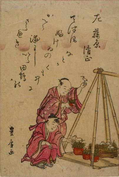 Editor: This is "Children at Play" by Utagawa Toyohiro, made around the late 1700s, I believe. It's a woodblock print, and I'm struck by how playful and lighthearted it feels. What do you see in this piece, considering its place in society at the time? Curator: Well, prints like this played a significant role in disseminating cultural values. Notice the children's attire and activity. How do they reflect the social expectations of children in Edo-period Japan? Consider the narrative it constructs – the accessibility of play and the importance of leisure. Editor: That's fascinating! It's almost like a snapshot of childhood ideals of the time. I hadn't thought about how deliberate the imagery might be. Curator: Exactly! And think about the market for these prints. Who was consuming them, and what did they want to see represented? Editor: So much more than just a simple image! Thanks for illuminating this. Curator: My pleasure. It is always rewarding to consider the socio-political context shaping artistic expression.