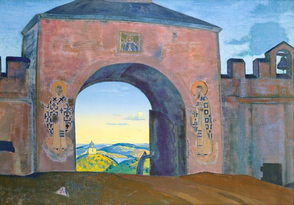 Curator: Looking at "Old Pskov," painted by Nicholas Roerich in 1922, now housed at the Nicholas Roerich Museum, what are your initial impressions? Editor: There’s something undeniably melancholic about this scene, isn’t there? The colors are muted, the composition seems to compress the architectural space, giving it a feeling of enclosure and… almost abandonment. Curator: Right. Roerich created this work using tempera and oil paint; look at the layering. You can really see how he's building up the paint to capture the texture of the stone and plaster. It seems relevant, considering Russia was undergoing profound shifts after the revolution; resources for building and maintenance must have been extremely limited. Editor: Precisely! Pskov, an ancient city, serves as a powerful symbol here. We see this city not just as a geographic location but as a repository of Russian history and cultural memory. The medieval style Roerich evokes positions Pskov as this enduring symbol for Russia's avant-garde movement. But how much is this iconography simply a consequence of the painting techniques available? Curator: That's a fair point, given the materials accessible during the time. However, I believe that the choice of imagery interacts with his color choices. The soft blues, pinks, and whites contrasted against darker hues definitely evoke a dream-like quality. Perhaps reflecting a yearning for the past or, even more, a hope that traditions will withstand contemporary shifts in ideology and materiality. Editor: And those arches, repeated like frames within frames, they almost feel like barriers. Are they historical remnants, romanticized, or critical statements about social stratification? We have a church on a raised part of the topography while this lone figure to the left almost cowers beneath a covered corridor. The piece encourages critical consideration of public roles in both religious and temporal domains. Curator: I agree. It certainly doesn’t present a purely celebratory view of the past. He acknowledges that history is multifaceted, textured by labor, belief, and human endeavor. I think understanding this from both historical and materialist perspectives encourages visitors to critically assess representations of culture and societal change, even today. Editor: Indeed. "Old Pskov" isn't simply a depiction of a place; it is a multi-layered visual articulation that speaks volumes about resilience, loss, and enduring value in the face of societal change. It's heavy with implications. Curator: Agreed. Roerich’s "Old Pskov" presents not only a visually striking cityscape, but invites dialogue and encourages us to look carefully at history through the lens of materiality, practice, and perspective.