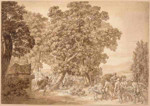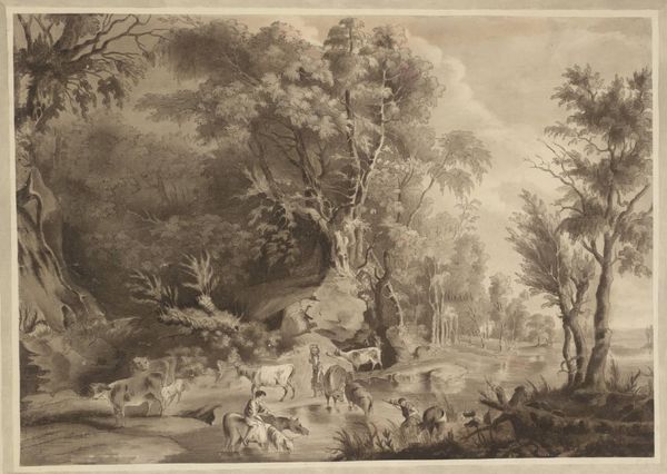 Curator: Here we have William Woollett's "The Pleasures of Summer," created sometime in the 18th century. Editor: The scene exudes a serene, almost dreamlike quality; the tonal range is beautifully subtle, giving the piece a subdued yet inviting presence. Curator: Indeed. Consider how Woollett uses water as a symbol, reflecting the figures and landscape. It speaks to themes of reflection and mirroring. Editor: And how the figures interact with the water—bathing, boating. There's a clear connection to nature, but the idyllic image suggests a deeper longing for a simpler, more harmonious existence. Curator: The artist's technical skill in rendering light and shadow cannot be overlooked; it constructs a sense of depth and space, contributing significantly to the image's semiotic structure. Editor: Ultimately, this artwork invites us to ponder the cultural idealization of summer and how we project our desires onto the natural world. Curator: A keen observation; it does underscore how art functions as a framework through which we come to understand ourselves and society.