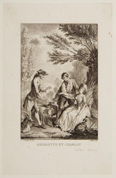 Curator: Here we have Daniel Berger's "Illustration to Tristram Shandy, p.7: Rider with a Long Nose on an Ass Admitted through a Town Gate," residing here at the Harvard Art Museums. Editor: The density of line work immediately strikes me, creating such rich textures. You can practically feel the weight of that overgrown tree. Curator: Yes, Berger was working within a tradition of satirical illustration, and these densely worked prints were easily reproduced and widely circulated to fuel public discourse. Editor: The tonal range achieved is remarkable. Look at how the light catches the woman's dress, a stark contrast to the shadowy undergrowth nearby. Curator: Indeed. And consider the social commentary embedded in the scene, questioning access, privilege, and perhaps even mocking the perceived authority of those entering the town. Editor: It is a visually compelling piece that pulls you in. I find myself pondering the play of light and dark, trying to discern narrative threads through its formal qualities. Curator: Exactly. The artwork underscores how the visual arts are always embroiled in social and political climates of their time. Editor: The artist certainly gives us much to consider, formally and thematically.