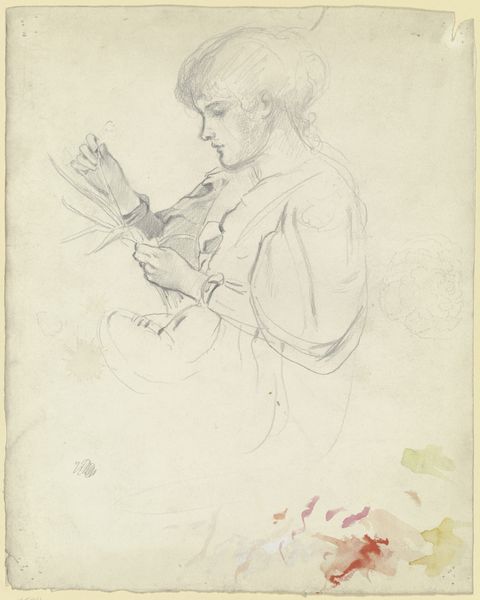 Curator: Let's consider this sensitive portrait of Shepard Alonzo Mount, created in 1827 by William Sidney Mount, rendered with such simple means—just pencil on paper. What's your immediate impression? Editor: There's an introspective quality. The sitter's downward gaze, the hand arrested mid-stroke… it feels like we're witnessing a moment of quiet contemplation, or perhaps the artist observing himself. A symbol of self reflection. Curator: The composition is masterful for its apparent simplicity. Note the delicate hatching that defines the form, and the contrast established only by subtle tonal modulations of pencil. What meaning is conveyed by the use of simple materials? Editor: The pencil, quill and inkpot are, I think, signifiers of the importance of writing and recording at this time. The very act of drawing and writing with rudimentary technology would likely mean there is thought, precision, and care when representing such information in the past. It is almost ceremonial. Curator: Yes, the medium lends an air of immediacy to the final portrait, as though capturing a fleeting moment of his thought. Observe the slightly obscured details; there's a palpable tension between clarity and suggestion, the overall structure created through lines defining form without a need for filler. Editor: I think also there is some allusion to romantic ideals and notions of youth and the passing of time represented here. Note the detail in his jacket - a symbol of upward mobility as it was considered formal clothing worn mostly by gentlemen and not associated with rural workers who could not afford it at that time. It stands in sharp contrast with the rudimentary materials that mark this moment. Curator: I can appreciate that read. Certainly the figure is immersed in a world of symbols, each contributing to the portrait's overall effect. The romantic era shows many individuals that are in their writing space creating for a more informed community, but not necessarily taking into account class disparities. Editor: True, his class position likely afforded the education for such artistic pursuit. Nevertheless, the young man lost in his work becomes an emblem of personal focus amidst societal structures and progress, a theme still resonant today. Curator: Indeed. A seemingly simple sketch, yet deeply layered with nuanced observations on both form and the individual portrayed. Thank you for providing more detail around this piece. Editor: Likewise; understanding these symbols adds another layer to one’s experience of this striking drawing.