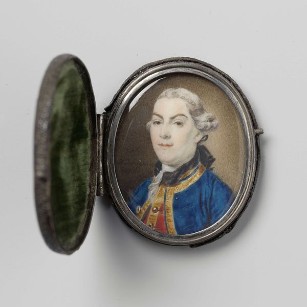 Curator: This miniature portrait, simply titled "Portret van een man," dates back to 1755. Joseph Marinkel created it, and it's part of the Rijksmuseum's collection. Editor: It's incredibly intimate! The soft pastel colors, the way he seems to be glancing sideways…it gives the impression of catching a fleeting moment, a stolen glance. It has an ethereal almost nostalgic feel, it is precious but who could have carried it? Curator: Well, consider the Rococo period. These miniatures, often rendered in watercolor, were potent symbols of status and affection, designed for intimate viewing and portability. Think about the sitter's clothing too, signaling his privileged societal standing. It’s a tiny object with so much contained within. Editor: Yes, you're right. This wasn't some impulsive snapshot, but a carefully constructed image meant to convey a specific message. The clothing is so important, a marker of privilege in an unfair hierarchical structure. How much agency did the sitter have? Did Marinkel have much room to move? Curator: That’s the core tension, isn't it? The Rococo style, known for its ornamentation, played with codes. There’s the delicate realism of the subject's features, balanced with the artifice of powdered hair and formal dress. The symbolism here transcends simple likeness; it encapsulates social identity and ambition in the 18th century. Editor: Absolutely. Seeing this today, I’m reminded that art never exists in a vacuum. Even the daintiest trinket carries the weight of its time. This portrait speaks volumes about who held power and who didn't, who had the privilege of being remembered. The gaze is direct. But who do we give that agency to: Marinkel for placing it there or the man within it? Curator: These considerations are invaluable. What appears at first as a charming, diminutive portrait unlocks an abundance of insights, not only into art history but also into how power dynamics played out and have lingered for so long. Editor: Precisely. Now when I view it I will reflect more deeply about power and about social structure within the Rococo art world.