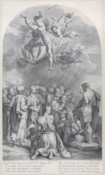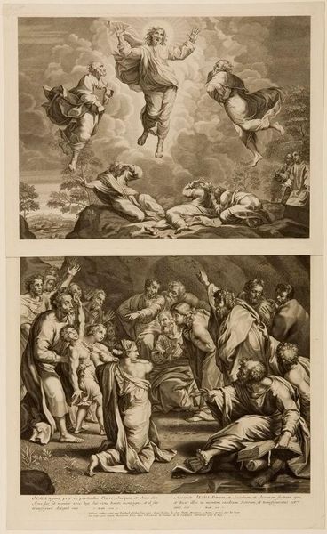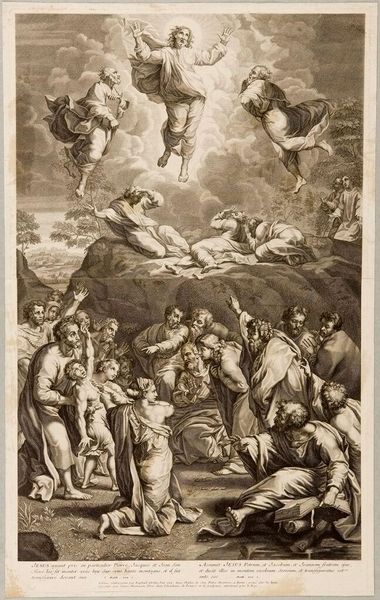 Curator: This is Auguste Gaspard Louis Boucher Desnoyers's "The Transfiguration," currently held at the Harvard Art Museums. The plate measures approximately 77 by 54 centimeters. Editor: It has an overwhelmingly dramatic atmosphere. The tonal range is skillfully rendered, creating a compelling contrast between the celestial and the earthly realms. Curator: Indeed. Desnoyers, active in the 19th century, was known for his engravings. He translated paintings into print, enabling wider accessibility to masterworks. This piece exemplifies that. Editor: The composition is notably divided. The top section is brighter with ethereal figures, while below, we observe a crowd in darker tones, gesturing upwards. The artist uses this contrast to emphasize the divine event. Curator: Precisely. The transfiguration narrative historically serves as a pivotal moment in the gospels, symbolizing revelation and the bridge between human and divine understanding, a message effectively conveyed through Desnoyer's printmaking. Editor: A compelling and engaging image; its structural and tonal arrangements really enhance the dramatic religious event depicted. Curator: Yes, a wonderful example of the power of reproductive engraving in disseminating important religious and cultural narratives.