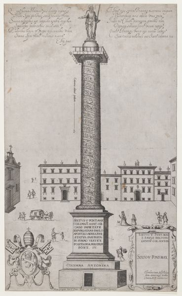 Editor: This engraving from 1544 depicts Trajan's Column, now residing in the Metropolitan Museum of Art. What immediately strikes me is its imposing presence against what appears to be a cityscape. What's your interpretation? Curator: Indeed. This image serves as a fascinating document of how classical power was being understood and re-presented in the Renaissance. Think about it: this print makes accessible, to a wider audience, a monument erected to celebrate imperial Roman power. It's not simply a rendering; it’s an active participation in the ongoing construction of history and authority. Editor: So it's about more than just visual accuracy; it's making a statement about power? Curator: Precisely. This column wasn't just about celebrating Trajan's victories, but embedding those victories, that imperial project, within the urban fabric of Rome itself. The spiral frieze is essentially a propaganda scroll writ large, displaying military campaigns in vivid detail for public consumption. Now, how does replicating this image in a print form, centuries later, change its function? Editor: I guess making it a print democratizes access, but it also somewhat… flattens the impact? It’s a reproduction, not the real thing towering above you. Curator: Interesting. Does that distance lessen the column's original purpose, or does the act of reproduction imbue it with new layers of meaning related to artistic skill, historical study, and collecting? Perhaps this engraving aims to not only document but also revive a sense of Roman grandeur. Editor: I never considered the engraving as having its own form of power by spreading that original message. Thanks for pointing that out. Curator: My pleasure. Looking at it that way gives a new depth.
