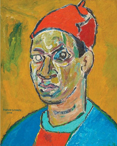 Curator: Let's consider this stark "Self-Portrait" from 1907, painted by Pablo Picasso using oil on canvas. Editor: The immediacy is what strikes me first. Those piercing, almost confrontational green eyes feel intensely present. The palette is earthy and somewhat raw. Curator: Indeed. At the time, Picasso was heavily influenced by Iberian sculpture and the looming presence of Cézanne’s geometric explorations. This self-portrait is positioned right before his full immersion into Cubism, a pivotal time for him. The way he simplifies forms really underscores a departure from earlier academic styles. Editor: There's definitely a powerful symbolic weight carried by those almost almond-shaped eyes; throughout history, such forms have been associated with heightened perception and spirituality. They are large, luminous...almost otherworldly. Curator: It’s crucial to view this within the broader context of the avant-garde movement. Traditional portraiture was being challenged. It was no longer about faithful representation but about conveying something deeper – emotion, essence, the artist’s inner world. The slightly unsettling nature of the piece only reinforces this aim to disrupt convention. The piece debuted at a time when public views of art and the role of the artist were in dramatic flux. Editor: Precisely. The earthy tones – ochre, burnt umber, shades of pale pink - perhaps hint at a grounding force. Despite the fragmented planes and the abstraction, it feels incredibly anchored, not just physically to the canvas, but to the artist’s very being. One can trace a line straight through Western portraiture to this image and appreciate it anew. Curator: I concur. The distortions challenge our perceptions of identity and representation, reflecting the rapidly changing cultural landscape of the early 20th century. Editor: It's a striking premonition, perhaps, of the fractured world that lay ahead, viewed through Picasso’s penetrating gaze. Curator: A gaze that continues to compel, challenge, and, above all, inspire dialogue to this very day.