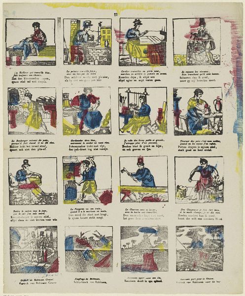 Curator: "De guitenstreken van Ernest / Le espiègleries d'Ernest"—or "The Pranks of Ernest"—this charming print created by Brepols & Dierckx Zoon, dating somewhere between 1833 and 1911, presents a series of vignettes that immediately struck me. What's your take? Editor: It's the chromatic simplicity. The print, made with rudimentary colors, depicts what appears to be the chronicle of this kid’s bad behavior. Is it chromolithography perhaps? Curator: Most likely. Given its publication dates, this method would suit the period. Let's focus on the imagery. I see repeating symbols of disruption; food being mismanaged, animals being bothered... it suggests a breakdown of domestic order. Editor: I see how the figure of the child, through repetitive imagery, becomes almost archetypal. Mischief and childhood have always been linked visually. Consider the cherubs of the Renaissance or even folklore tales of mischievous imps and sprites. This print fits into that enduring tradition. But let’s examine the conditions of printmaking; what level of craft lies behind it? Curator: Good question. The use of simplified line work hints that this work must have had wide appeal. Perhaps it was distributed within magazines or newspapers or for elementary reading books. The medium impacts our understanding. This artwork can tell us how it was consumed. Editor: And how perceptions of childhood were packaged and commodified! To what degree was childish naughtiness simply entertainment for adults and how the values of the middle classes contributed to their depiction in printed material. Fascinating how this print contains layers of cultural values of the past. Curator: Indeed, seeing the imagery of misbehaving alongside a cost-effective mass printing solution highlights societal and manufacturing forces, at once. Editor: Ultimately, looking at this piece is a chance to decipher how social ideals of youth are constructed via the power of symbolic representation. It encourages us to look beyond the sweet depictions and see their true, multi-layered cultural and historical content. Curator: I appreciate you pointing out these symbolic details, as I focused on the materiality. Together, we've opened this "Pranks of Ernest" to highlight the significance of its production. Editor: Likewise, delving into its means and circulation revealed much about this deceptively innocent artwork.