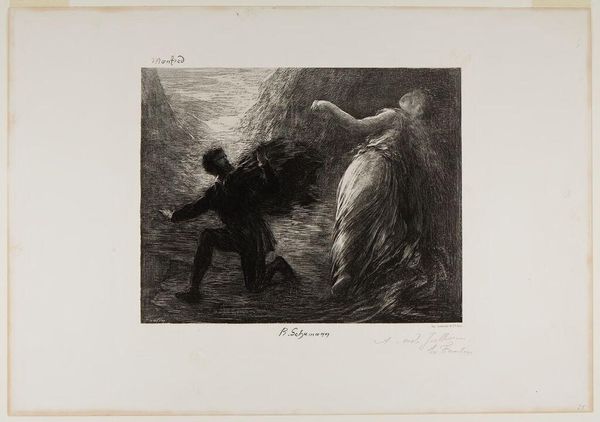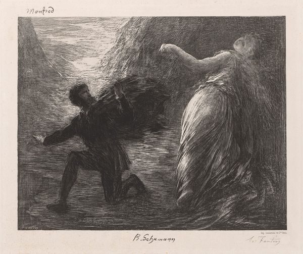 Henri Fantin-Latour created this lithograph, Deposition from the Cross, capturing a moment laden with sorrow. Here, the body of Christ is being taken down, surrounded by mourners. The figures are shrouded in cloaks that obscure their identities, emphasizing universal grief. The image evokes the 'Imitatio Christi,' a devotional practice that encourages believers to intimately identify with Christ's suffering. Consider the motif of the Pietà, where Mary cradles her son’s body; it echoes across centuries, from medieval sculptures to Renaissance paintings. The gesture of cradling suggests not only sorrow but also a timeless echo of maternal love and loss. The presence of angels in the composition, with their wings outstretched, points to celestial lament. This draws parallels with ancient depictions of winged deities attending scenes of death. These recurring visual themes tap into our collective memory, a deep well of shared human experience. Fantin-Latour masterfully channels this emotional power, engaging viewers on a profound, subconscious level.