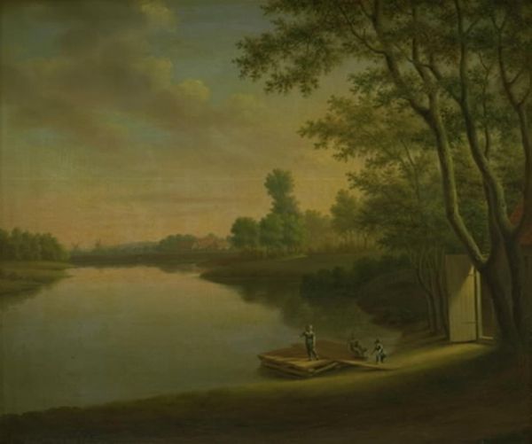 Curator: Immediately I see twilight. Everything is suffused with that dreamy, dusky pink. It's quite calming, really. Editor: I find this so visually dense. Let me introduce you to Johan Mandelberg’s, “Landskab i hollandsk manér”, which roughly translates to "Landscape in the Dutch Manner," believed to have been created between 1745 and 1786. This oil on wood, housed here at the SMK, depicts a pastoral scene brimming with activity. Curator: Pastoral indeed, but with a kind of still quality. It feels less like pure observation and more like memory—that idealized, ever-so-slightly hazy recall. And all those figures, cows, buildings... it's like he wanted to fit the whole world into one snapshot! Editor: Well, landscapes in the Dutch style were incredibly popular, often carrying symbolic weight. Notice how the light catches on certain figures. Mandelberg plays with Baroque and Realistic conventions. Genre scenes like these weren't just pretty pictures. They hinted at the divine order of the natural world, often laden with subtle metaphors. Curator: Perhaps that’s the Baroque showing its hand! All that symbolism... I do love how seemingly ‘ordinary’ these scenes are – like little stolen moments. The fellow poling the boat; that woman with the wading cow – yet they feel imbued with a sense of... destiny is too strong, perhaps, but meaning certainly. What about those ducks bobbing in the left corner; are they a commentary on something? Editor: Ha! Ducks might signify domesticity, the everyday cycle of life and whatnot, or simple whimsy—it depends. Given Mandelberg's background, perhaps, but it could all simply represent a harmonious, divinely sanctioned way of life, painted with remarkable clarity, however dreamy its colors might seem to you. Curator: I’ll concede a hint of destiny... the water gives it that depth. It’s as though he has caught a whole microcosm here by this bank. Alright, you've persuaded me, even that slightly melancholy sunset suggests a much wider implication. Editor: Then, hopefully we have given everyone an intriguing glimpse of that potential in Mandelberg’s view! Curator: Indeed, and perhaps a quiet moment of contemplation in this often too loud world of our own.
