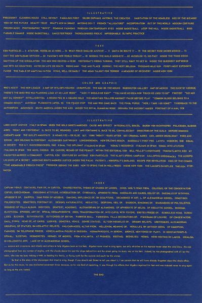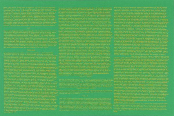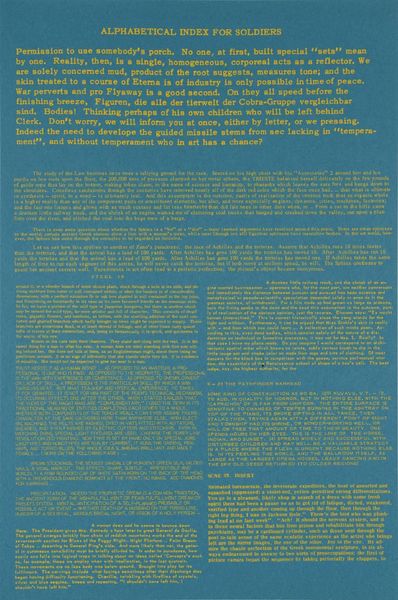 Curator: This untitled print by Eduardo Paolozzi presents a dense field of text, almost an illegible block. It reminds me of information overload, reflecting the post-war anxieties Paolozzi explored. What are your first impressions? Editor: It's visually overwhelming! It's just this solid block of green text on a blue background. It feels intentionally inaccessible, like a secret language. What do you see in it? Curator: I see a critique of mass media and the relentless flow of information. Paolozzi was deeply concerned with how technology and consumerism shaped our identities. Does this artwork make you consider who controls the narrative and whose voices are amplified? Editor: Absolutely. It makes me think about how we filter information and what gets lost in the noise. Thanks for helping me see how this piece comments on society. Curator: It shows how visual art can dissect systems of power, and how artists confront the status quo, making us more mindful of the social constructs in our lives.