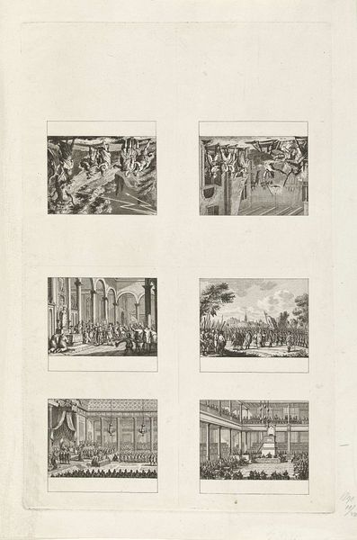 Curator: Welcome. Before us is “Scenes from the Life of Saint Francis of Assisi,” an engraving created by Bernard Picart in 1734, currently held at the Rijksmuseum. Editor: The layout strikes me first—four scenes presented as sequential panels. There’s an orderly, almost classical feel despite the Baroque style. It gives a sense of the epic condensed to the intimate. Curator: Indeed. Picart, skilled in etching and engraving, here offers a visual narrative of the saint’s life, a form favored in religious and historical painting. Look at how the imagery in each panel operates—note the classical architecture juxtaposed with stark scenes of penance and miracle. Editor: I see the recurring motif of transformation. We have destitution to grace, earthly to heavenly—each composition seems deliberately constructed around stark contrast and transitions. Curator: That’s accurate. The figures of Francis embrace powerful symbolism of piety, sacrifice, and, ultimately, sainthood. Consider the light emanating from the top right panel— the glow signifies not just divinity but the saint’s inner luminescence reflected outwardly, influencing the beholder. Editor: What truly stands out is how he contrasts architectural forms with more elemental, “natural” scenes, like the figures in winter struggling on the lower-left. The sharp precision and calculated distribution of light adds so much depth. It's less about visual unity, it's the dynamic between scenes. Curator: The classical structures likely are employed as familiar visual tools meant to convey ideas of civilization and God's place in society. This kind of visual reference reinforced established values but could offer the opportunity to examine social duty or expectations critically. Editor: Well, looking at it now, you definitely led me down a more iconographic reading. Initially, I thought it appeared classically styled and Baroque, which led me to evaluate how composition guides interpretation. Curator: We've each extracted some important meanings from this particular visual rendering of Saint Francis' journey. Thank you for the valuable insight. Editor: Thank you for the cultural depth of interpretation.