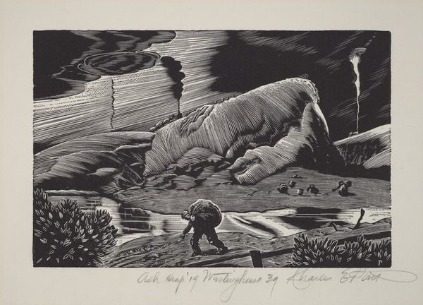 Curator: Here we have Vance Hall Kirkland's 1931 print "Trout Stream," a striking black and white depiction of a mountain waterway. It really grabs your attention, doesn’t it? Editor: It does. My first impression is that there is something vaguely unsettling about it, something in the graphic starkness. Even though it's a landscape, it evokes an emotional drama. It's not simply descriptive. Curator: Absolutely. What I find fascinating is the historical context of this piece. It was created during the Depression era, when many artists grappled with portraying both the beauty and harsh realities of the American landscape. It echoes, for me, some of the regionalist printmakers of the time, though leaning more towards a unique surrealist touch. Editor: Yes, you can certainly see that thread. The way the water flows in stylized curls and the unnatural shapes of the rocks suggests an almost dreamlike quality. Even the skeletal tree on the left carries symbolic weight, doesn't it? It's as if it has surrendered to the force of the environment around it, yet stubbornly perseveres. A powerful symbol of resilience. Curator: I agree completely. Its very much aligned with surrealism, which was popular back then and offered artists ways to use landscape for otherworldliness. What strikes me is Kirkland’s willingness to play with perspective and abstraction in order to evoke a more visceral reaction, more personal understanding. It really showcases his skill as a printmaker and draftsman, but he clearly goes beyond the simple execution of visual details to tell a symbolic story. Editor: The black and white medium lends itself perfectly to this stark symbolism too. The dramatic light and shadow adds an extra layer of intensity. Almost biblical somehow, as a testament of something very monumental to human perseverance, and our connection to nature and perhaps a loss of it as well. It invites deep introspection. Curator: The way Kirkland contrasts the smooth water with the jagged rocks makes it feel like the stream is both a source of life and a destructive force. Editor: This piece remains intriguing, doesn't it? Its stark composition makes us aware of symbolic meanings of water, and endurance of a spirit over changing landscape. Curator: Indeed. “Trout Stream” truly exemplifies how artists can engage with social realities. It is indeed a powerful piece that goes beyond mere observation to capture a time.