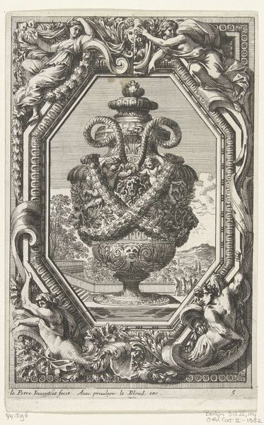 Jean Le Pautre created this print, "Vaas in cartouche," during the Baroque period when French society was rigidly structured by class, with the aristocracy enjoying immense privilege and power. Enclosed in an ornate cartouche alive with figures, foliage and a draped curtain, sits an elaborate vase. This composition, rich with classical figures and formal gardens, reflects the values of the aristocracy, their love of display and power. Le Pautre, working during the reign of Louis XIV, catered to the tastes of the French court, producing designs that celebrated luxury and grandeur. But the print also hints at underlying tensions, as the opulence of the aristocracy stood in stark contrast to the lives of the common people, who often faced poverty and hardship. The contrast is both breathtaking and, perhaps, unsettling. The idealized figures and landscapes mask the social and economic realities of 17th-century France.