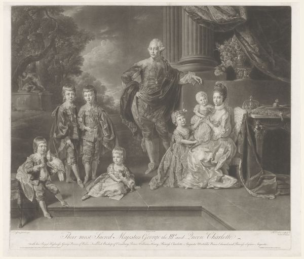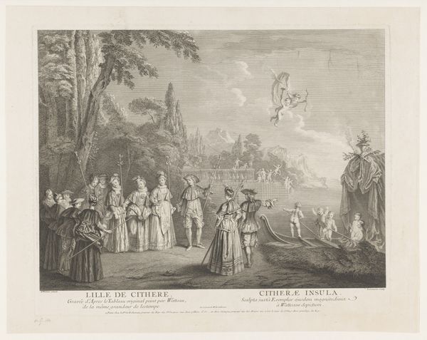 Curator: Here we have an engraving, "Portret van Marie-Anne Botot Dangeville in een tuin met kinderen," from 1732, crafted by Jacques Philippe Le Bas. It's a piece held within the Rijksmuseum collection. The baroque aesthetic and use of light are very strong, what do you think? Editor: There's a whimsical theatricality to this piece, almost as if a scene from a play is frozen in monochrome. It evokes the artificial paradise and constructed pleasures enjoyed only by the elite. Curator: Indeed. Le Bas was primarily an engraver and printmaker, working in a period where print served as both an art form and a crucial tool for disseminating images and ideas. How do you interpret this piece as a document of its time? Editor: Considering Dangeville's profession, her presence signifies more than simple portraiture. The work acknowledges female theatrical agency, although likely curated, while also showcasing the family amidst trappings of privilege dependent upon a stratified labor system and mercantilist enterprise. How conscious do you believe Le Bas and Dangeville were of the role these prints played in shaping public opinion of actresses? Curator: Printmaking in this era served as a mechanism for social mobility for some and for reinforcing hierarchies for others. Disseminating these engraved portraits aided in creating celebrity culture, but more than that, examining the labor, skill, and artistry involved pushes beyond mere surface and ventures into the complexities of production. Note also the paper and ink—both were luxury items subject to trade routes and class status. Editor: Absolutely. It invites reflection on visibility, representation, and the economic conditions that permit someone to be seen and celebrated. The surrounding figures invite conversation around performance, leisure, and spectatorship—but this vision of idyllic repose occludes the reality for most. Curator: And how far does this genre of art succeed, if it even tries, in mirroring an objective point of view on life at that period? The creation itself changes perception; in reality the piece serves as an enduring fabrication, don't you think? Editor: I think any attempt to objectively capture lived experience will fall short. However, engaging with artworks that may not reflect a fully accurate story encourages discourse, critique, and intervention, prompting questions regarding the stories that are elevated against those that remain obscured. Curator: That’s a great point. It encourages new avenues of investigation beyond simply its pure aesthetics. Editor: Exactly. Thanks for pointing out those intricacies with such nuance, this has been truly enlightening.