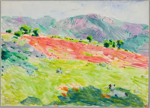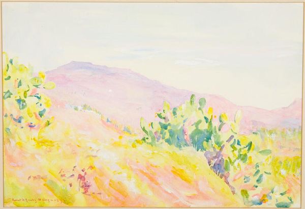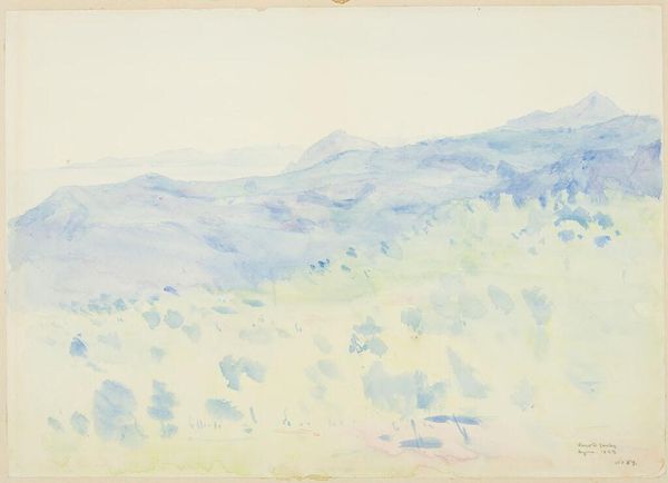 Curator: This is Denman Waldo Ross's watercolor, "Landscape near Patras, Greece." Editor: It feels airy, almost dreamlike. The colors are so gentle. Curator: Indeed. Ross employs watercolor to evoke a sense of place, focusing on the materiality of pigment on paper, reducing the landscape to washes of color. Consider also the accessibility of this medium. Editor: The use of light, airy blues and yellows… the overall composition evokes classical Arcadia. It speaks to a longing for a simpler, more harmonious existence. Curator: Though seemingly straightforward, Ross’s landscape belies the commodification inherent in touristic representations, even through a medium like watercolor. Editor: Perhaps. But that doesn't diminish the resonance of the imagery, the echoing of landscape archetypes passed down through generations. Curator: A valuable reminder that even depictions of idyllic landscapes are created through specific material choices. Editor: And that images, regardless of material, carry enduring cultural meaning.