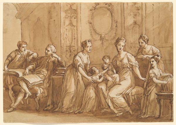 This drawing, known as "A Bedroom Scene," was made with pen and brown ink on paper by an anonymous artist. The linear quality of the drawing emphasizes form through the economical use of lines that define the contours of each figure. The scene is composed of numerous family members in a sick room surrounding an ailing patient. By attending to the materiality of paper and ink, one might ponder the ways in which an artwork’s perceived status influences its meaning and value. What is the relationship between the cost of materials and the labor involved, and how does it affect our perception? Although the drawing captures an intimate scene, we tend to associate ink drawings with the preliminary stage of producing art, as opposed to the final product. Understanding the materiality of an artwork helps challenge traditional hierarchies and distinctions between fine art and craft.
