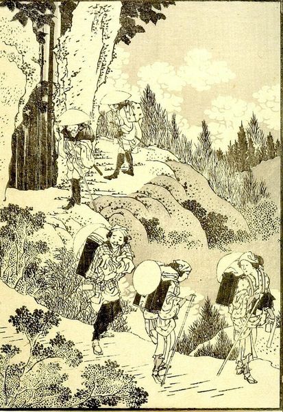 Curator: Here we have Katsushika Hokusai's "Fuji over a Waterfall," a detached page originating from his "One Hundred Views of Mount Fuji, Vol. 3." Editor: My first impression is the sheer weight of everyday life depicted against the sublime backdrop of nature. There's a tension here. Curator: Indeed. The waterfall acts almost as a curtain, partially revealing Fuji, a symbol of permanence. The human figures represent the transient nature of existence. Note how their path seems arduous. Editor: Right, this isn't just a landscape; it's a commentary on labor, perhaps even class. The figures are burdened, while Fuji remains untouched by their struggles. The birds overhead feel like a flock of aspirations or perhaps anxieties. Curator: Hokusai masterfully uses the waterfall as a dividing line, separating the mundane from the sacred, but always in relation to one another. He invites us to contemplate the divine through the lens of the everyday. Editor: Absolutely. And considering the context of its creation, amidst social and economic shifts in Japan, it’s hard not to read this image as a reflection on the changing relationship between people, land, and power. I find it strangely moving. Curator: Yes, Hokusai manages to capture both the timeless and the timely within this single frame. Editor: It's a stark reminder of the enduring power dynamics present even in the most beautiful landscapes. Thank you for pointing that out.