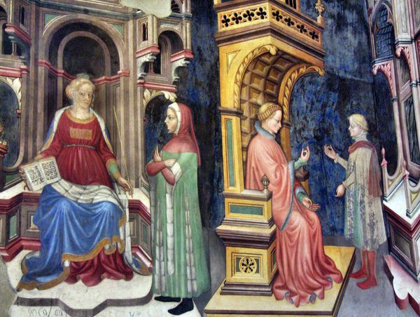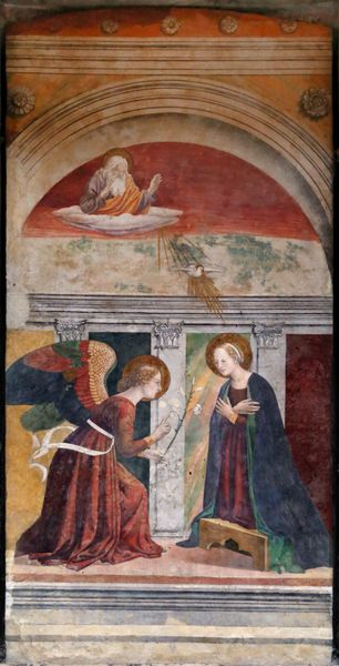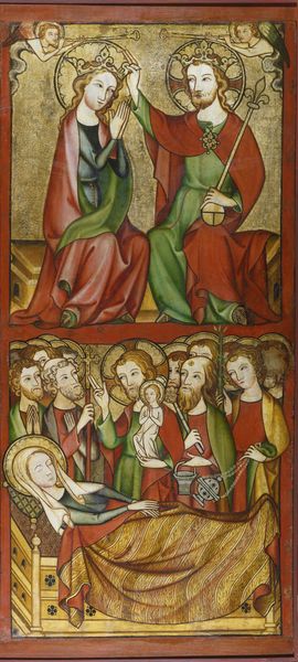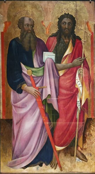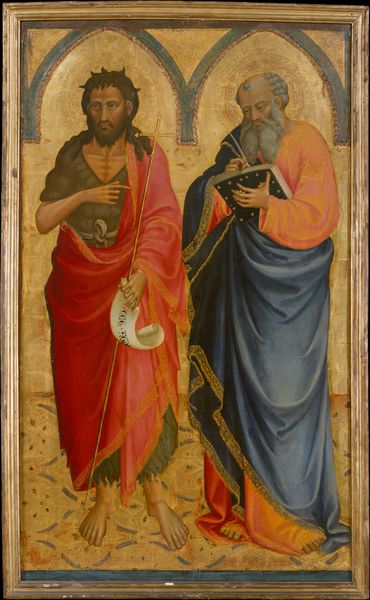 Editor: This panel painting from 1453 by Álvaro Pires de Évora depicts the Virgin Mary and St. John the Evangelist. It looks to be tempera on panel. I'm struck by the gold background and the rather somber mood. How should we interpret the choices in materials and presentation? Curator: Note how tempera allowed for those sharp lines, and that deliberate, flattened space emphasizes the here and now of religious experience as an active social and economic process. Think about who commissioned this. What sort of patron valued such obvious materiality? Editor: I see what you mean. It’s not about illusionism, but about declaring its own making. The gold leaf isn't trying to mimic light; it’s proclaiming value, wealth. Curator: Precisely. And look closely at the rendering of Mary's cloak – the intense blue pigment was extraordinarily expensive to source. Its ultramarine richness isn’t merely decorative; it's a statement about the investment in creating sacred imagery as a trade and cultural touchstone. Do you think the patrons appreciated such a visible expenditure? Editor: I imagine it signaled their own piety and status, a visual transaction with the divine and the earthly community. Curator: Exactly! So we have materials, artistic labour, religious messaging, and economic power all coalescing. Early Renaissance art, especially in panels like these, shows a very intentional connection between craft, consumption, and belief. Editor: That makes the somber mood more intriguing – it is less about sorrow and more about a deliberate display of constructed piety. I didn’t see that at first. Curator: Analyzing art through materials really opens up some fascinating lines of thought, doesn’t it? Editor: It does. I’ll definitely look at paintings differently now, thinking more about their physical presence as an assertion of labor, cost, and place within society. Thanks!