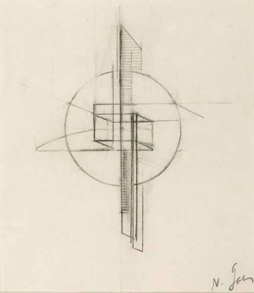Curator: Here we have a sketch by Naum Gabo. It's an intriguing arrangement of geometric shapes, all rendered in delicate pencil lines. What catches your eye first? Editor: It feels like a blueprint for a cathedral, or maybe a futuristic skyscraper. It's austere, but also aspirational, like a silent promise of progress. Curator: Gabo was a key figure in Constructivism, which sought to reflect modern industrial society. These precise lines and forms echo engineering and architectural design. Editor: I love how it suggests depth, even though it’s just lines on paper. It makes me think about how even the most rigid structures can have a spiritual core. Curator: Absolutely. Gabo believed art could reveal underlying cosmic truths through geometry. This sketch feels like a window into that search. Editor: It definitely makes you wonder about the relationship between the human-made world and the infinite. I feel like I could meditate on this for hours. Curator: It's that tension between the rational and the intuitive that makes Gabo’s work so powerful, isn't it? Editor: A fascinating glimpse into the mind of a visionary.